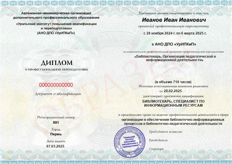 Да, дипломы и удостоверения оформляются в соответствии с действующим законодательством РФ. Документы печатаются на специальных бланках, заверяются печатью АНО ДПО «УрИПКиП».