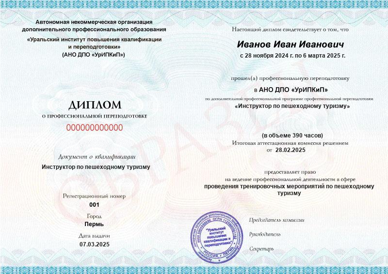 - Квалификация: Инструктор по пешеходному туризму
