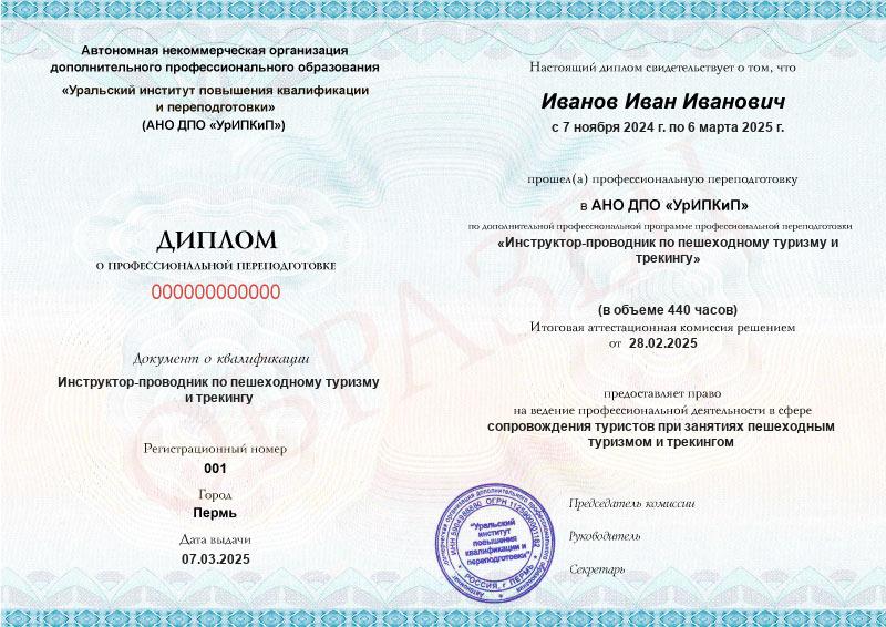 Профессиональный инструктор может организовывать походы разной сложности и выполнять обязанности сопровождающего только после аттестации. Чтобы пройти ее, нужно иметь диплом о высшем или среднем профессиональном образовании либо иной документ, подтверждающий профильное обучение. К таким относится диплом о профпереподготовке, удостоверение о повышении квалификации, свидетельство об окончании курсов.