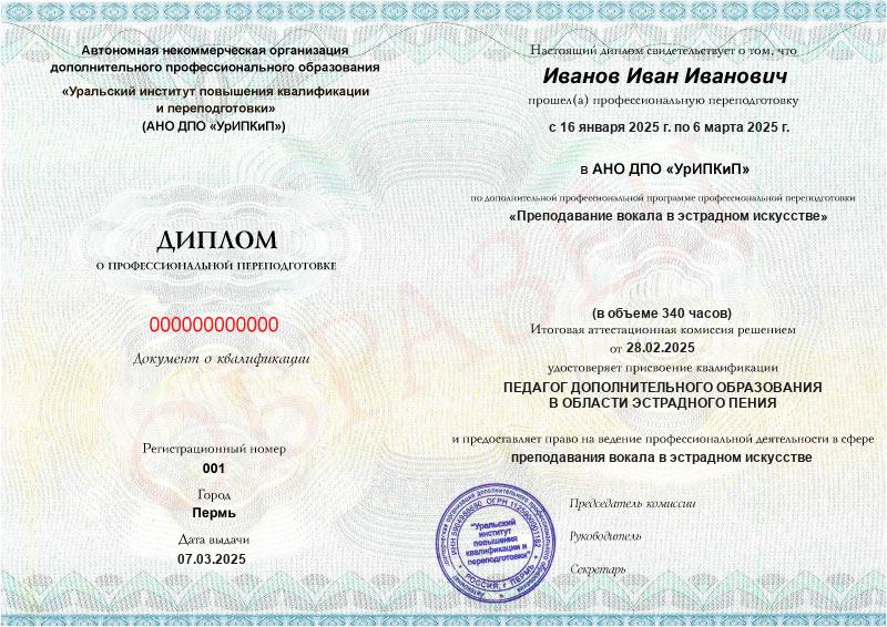 • Квалификация: Педагог дополнительного образования в области эстрадного пения