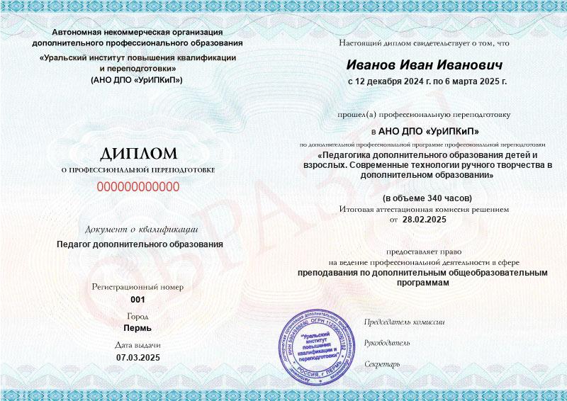 Да, дипломы и удостоверения оформляются в соответствии с действующим законодательством РФ. Документы печатаются на специальных бланках, заверяются печатью АНО ДПО «УрИПКиП».