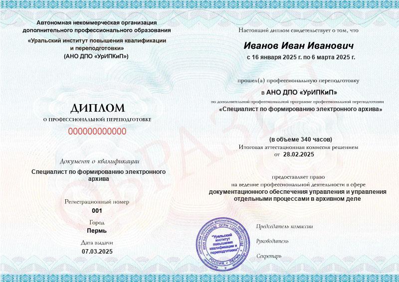 - Образец диплома о профессиональной переподготовке.