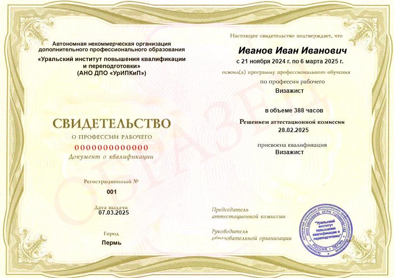 Свидетельство о профессии с присвоением квалификации «Визажист»Свидетельство действует на территории всей России и признается государственными и частными организациями